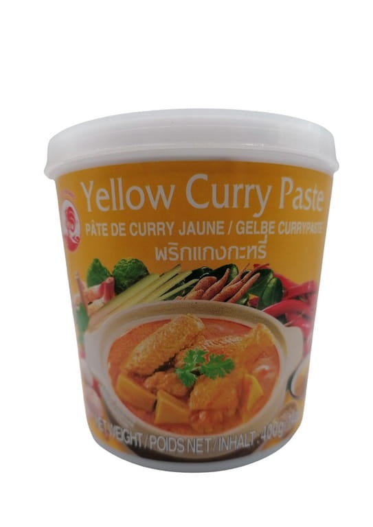 Żółta pasta curry jest najłagodniejszą ze wszystkich past. Polecana dla osób, które nie przepadają za bardzo ostrymi potrawami. Sporządzana na bazie chilli, trawy cytrynowej oraz kurkumy nadającej jej żółty kolor. Stanowi bazę żółtego curry.